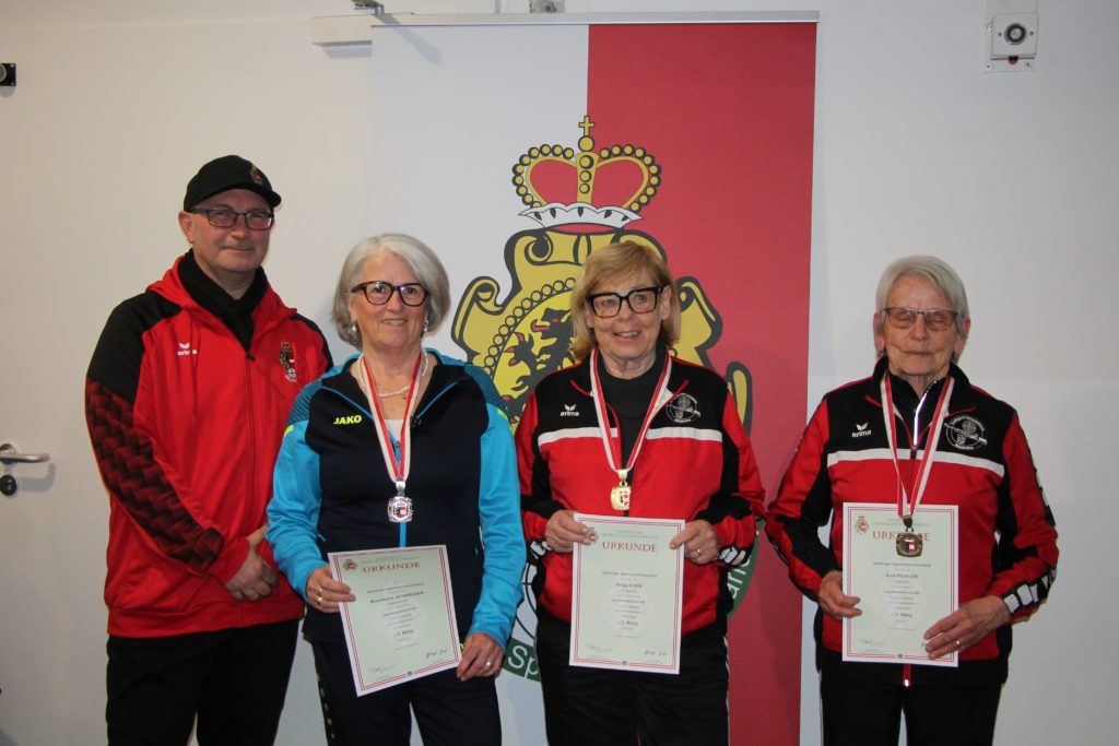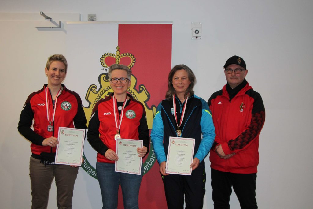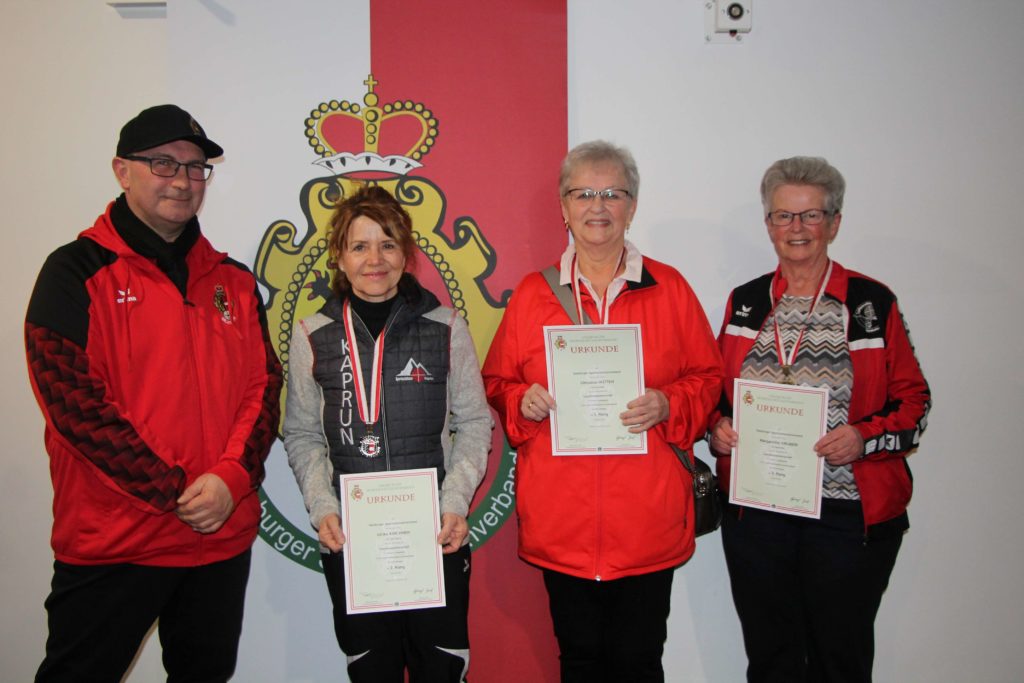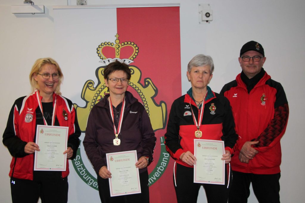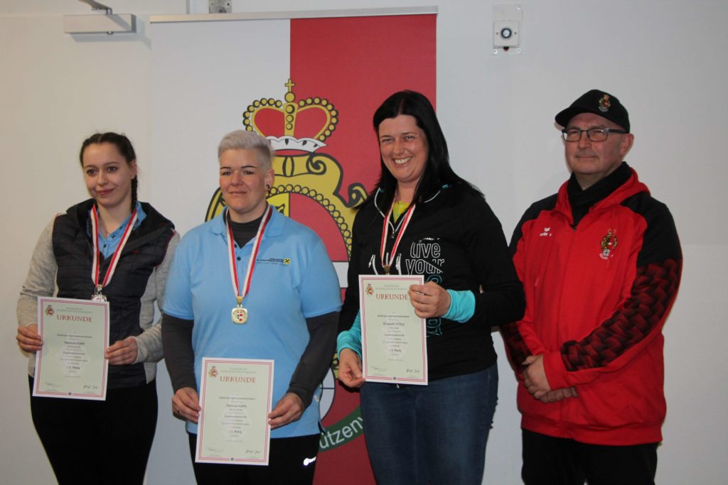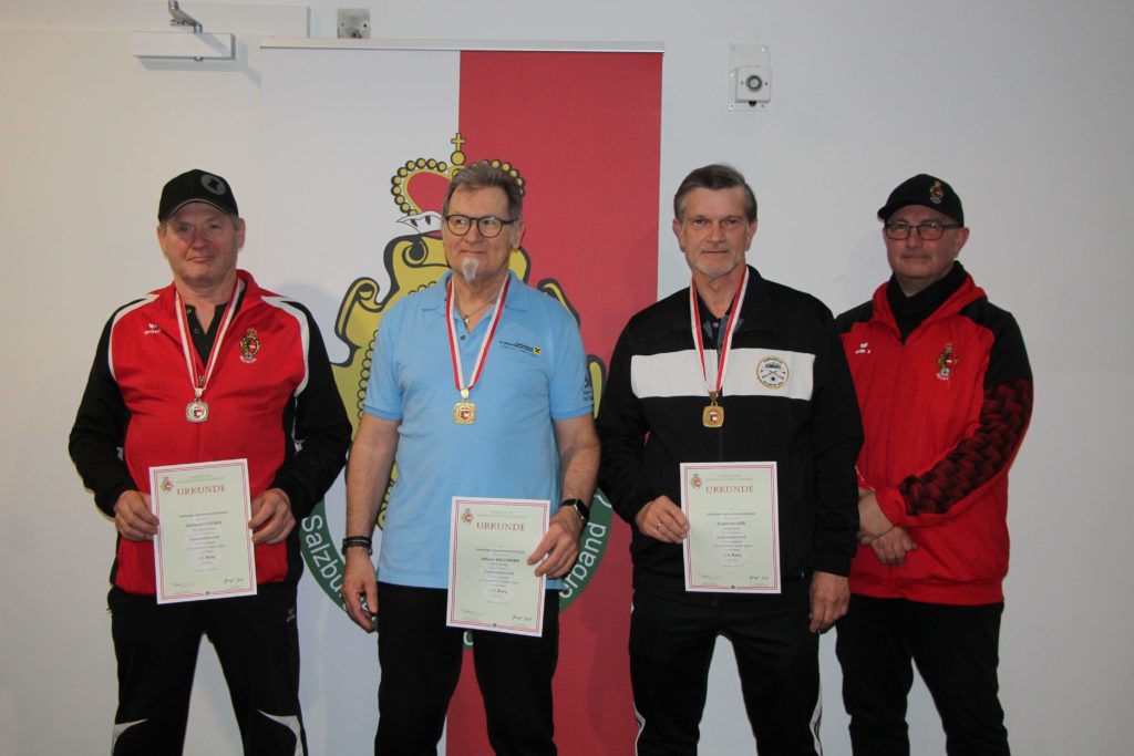 Am Nachmittag des ersten Tages zeigten dann die stehend aufgelegt Schützen ihre Klasse. Patricia Auen verteidigte mit 418,0 ihren Titel aus dem Vorjahr. In der Männerklasse blieb der Mauterndorfer Andreas Koscar mit 409,9 Ringen erfolgreich. In der Seniorenklasse 1 konnte der Lamprechtshausner Gerhard Bruckmoser mit 422,1 ebenfalls den Titel aus dem Vorjahr verteidigen. Er erzielte damit auch das höchste Ergebnis in den stehend aufgelegt Klassen. Bei den weiblichen Senioren I setzte sich das spannende Duell aus der Pinzgauer Bezirksliga auch bei den Landesmeisterschaften fort. Die beiden Mittersillerinnen Christine Brennsteiner und Barbara Glaser erzielten jeweils 416,3 Ringe, sodass die Innenringzehner über den Titel entscheiden mussten. Hier hatte Christine mit 33 : 30 die Nase vorne und konnte sich somit über die Titelverteidigung freuen. Bei den Senioren II ging der Titel mit 418,3 Ringen an den St. Johanner Johann Hallinger. Den Sieg bei den Seniorinnen II holte sich mit 415,1 Ringen die für Lamprechtshausen startende Sigrid Hailing. Gemeinsam mit Gerhard Bruckmoser und Gerhard Furtner konnte sie sich dann auch über den Mannschaftstitel stehend aufgelegt freuen. Sie verwiesen hauchdünn mit drei Zehntel Vorsprung die Mannschaft des SSSV Maxglan (Titelverteidiger) auf den zweiten Platz.